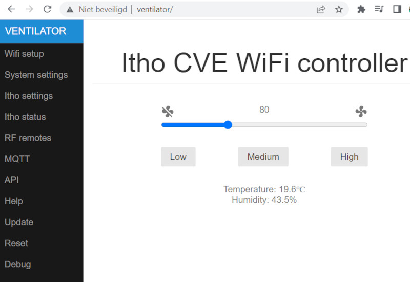 Installatie van de add-on is niet heel lastig. Als je de ventilator nu weer inschakelt zal hij een open WiFi netwerk tonen. Hiermee kan je verbinden en dan de wifinaam en wachtwoord van je eigen netwerk doorgeven. Geef ook meteen de ventilator een mooie naam, zo kan je later we webinterace van de add-on vinden. Opslaan en herstarten en klaar is kees. De details zijn te vinden op Arjen's site. Als je dit gedaan hebt, kan je de webinterface vinden onder de naam die je hebt doorgegeven. Hiermee kan je nu de ventilator aansturen en allerei informatie uitlezen. Als je (RF) afstandsbediening(en) hebt en de ook de RF unit van de add-on hebt aangeschaft kan je deze nu ook verbinden. Dit is een kwestie van eerst ontkoppelen met je LTHO box. Voor mijn type is dat de box uitschakelen en inschakelen. En dan binnen twee minuten 2 knoppen op de remote indrukken. Hiermee is de remote weer 'vrij'. Daarna kan je via de add-on module (en dan juist weer na de twee minuten) de remote koppelen aan de add-on. Dit werkt qua besturing beter/mooier dan de add-on via de LTHO box te laten werken. Ook dit staat in detail in genoemde handleiding.